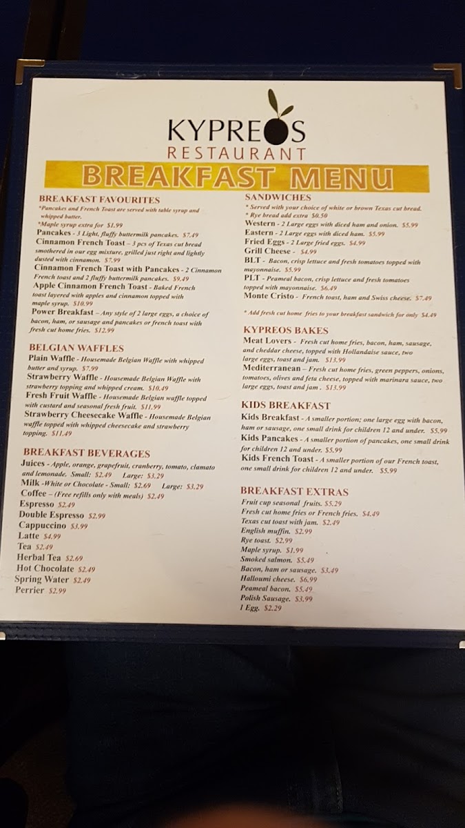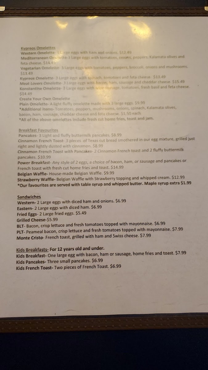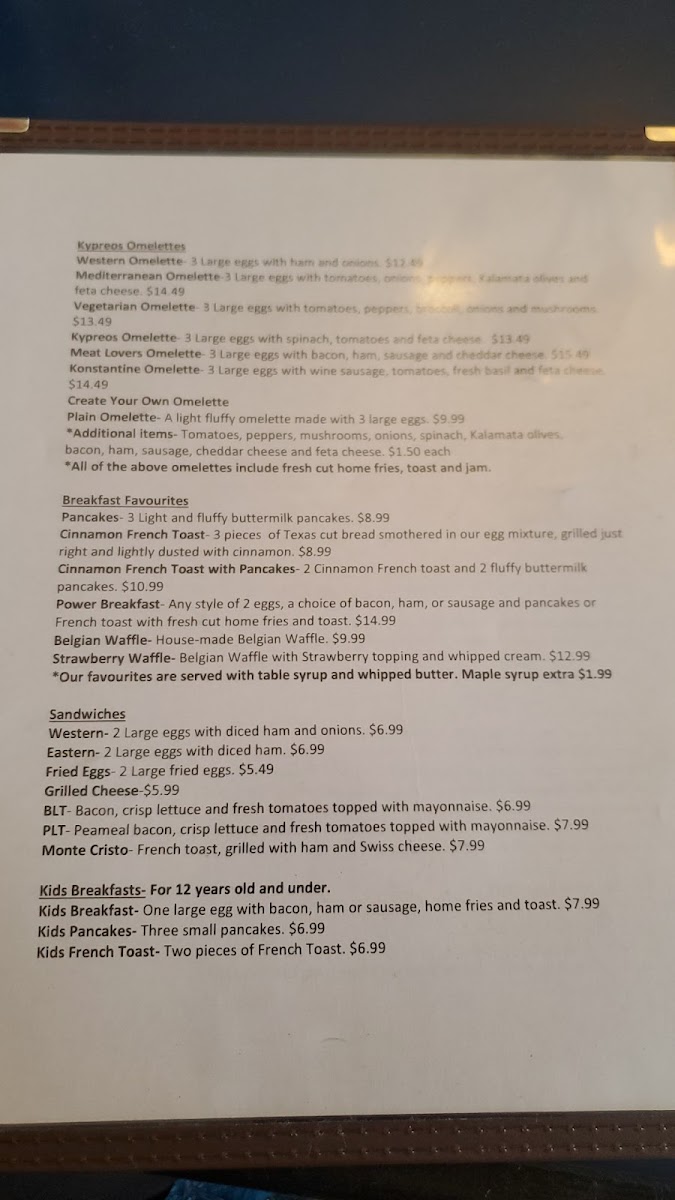 Welcome to Kypreos Restaurant, a culinary gem nestled in Kitchener, Ontario, where delightful flavors and warm hospitality come together. This inviting venue prides itself on a diverse menu that appeals to a wide range of palates. Start your meal with tantalizing appetizers like Calamari served with house-made tzatziki or indulge in the flaky goodness of Spanakopita. For salad lovers, the Greek Salad is a must-try, bursting with fresh ingredients and tangy dressing.